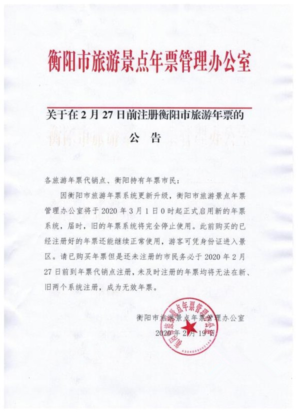 日前,衡阳市文旅广体局发布消息称,因衡阳市旅游年票系统更新升级,衡阳市旅游景点年票管理办公室将于2020年3月1日0时起正式启用新的年票系统。