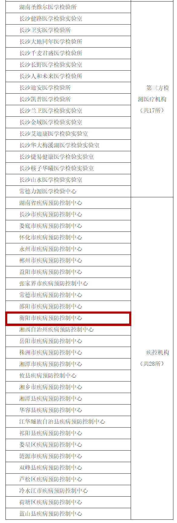 经国家卫生健康委临床检验中心《新冠病毒核酸检测信息平台》查询,湖南开展新冠病毒核酸检测的医疗机构名单5月19日下午公布。其中,衡阳有9家医疗单位可开展新冠病毒核酸检测,他们分别是南华大学附属第一医院、南华大学附属第二医院、南华大学附属南华医院、衡阳市中心医院、衡阳市第一人民医院、衡阳市第三人民医院、衡东县人民医院、常宁市人民医院、衡阳市疾病预防控制中心。具体名单如下: