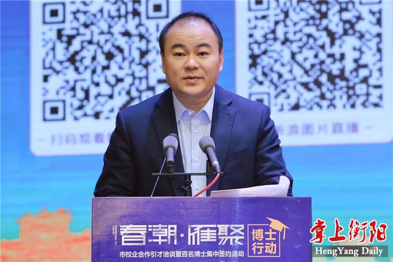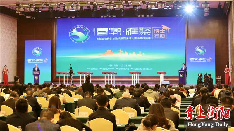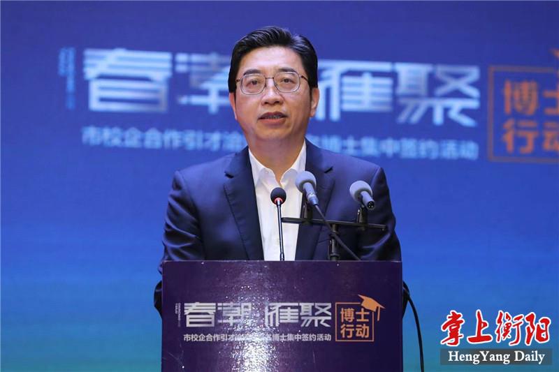 4月29日上午,“春潮·雁聚”博士行动——市校企合作引才洽谈暨百名博士集中签约活动在衡举行,市委书记邓群策在签约仪式上向五湖四海的人才发出诚挚邀请,期望各位才俊用所学所得的智慧之光,照亮深入推进“一体两翼”建设的腾飞之城,在衡阳这片高质量发展的热土上成就辉煌事业、书写精彩人生。市委副书记、市长朱健主持签约仪式。