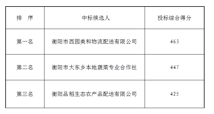 衡阳弘湘食堂食材(蔬菜类)于2021年7月28日下午3时00分(北京时间)进行了比选开标、评标活动,评标小组按照招标公告规定的评标办法及原则进行评定,确定中标候选人如下:
