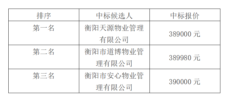 衡拖棚户区改造(一期)安置小区前期物业管理公司中标候选人公示