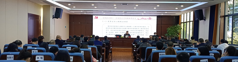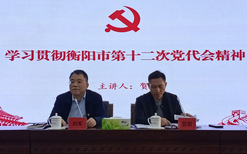 市第十二次党代会(本文简称党代会)是在习近平总书记考察湖南一周年之际、“两个一百年”奋斗目标历史交汇关键节点、全面建成社会主义现代化国家开局之年召开的一次十分重要的大会。按照市委、市政府工作部署,为深刻领会贯彻党代会精神,弘湘国投组织召开了专题宣讲会,为全体干部职工在以后的工作中提供思想和行动指引。由市委宣讲团成员、市委党校(衡阳行政学院)常务副校(院)长贺殷宣讲,弘湘国投党委书记、董事长刘军主持。