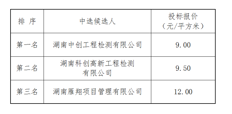 房屋建筑安全隐患专项整治检测工程于2022年8月15日上午9时00分(北京时间)进行了比选开标、评标活动,评标委员会按照比选文件规定的评标办法及原则进行评定,推荐中选候选人排名如下: