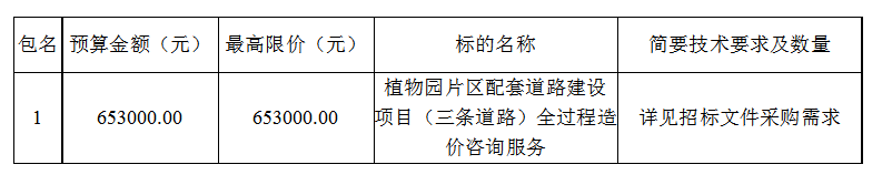 内容:负责完成植物园片区配套道路建设项目(三条道路)全过程造价咨询服务工作,具体服务内容见招标文件采购需求。