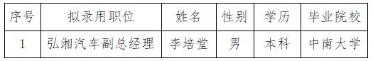 根据衡阳弘湘汽车科技有限公司招聘工作方案安排,在集团公司的监督指导下,经公开面试,拟录用李培堂为衡阳弘湘汽车科技有限公司副总经理,现予以公示。公示期间如有异议,请向衡阳弘湘国有投资(控股)集团有限公司纪检监察办公室反映。