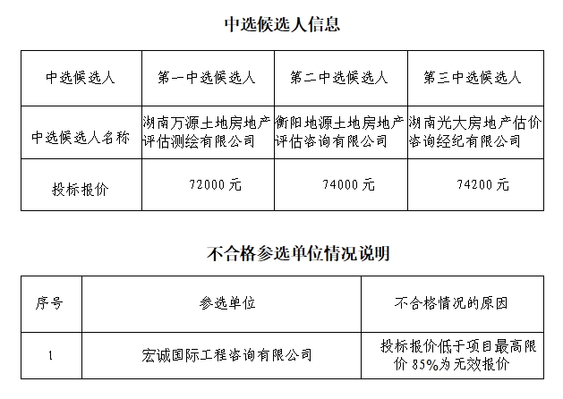 衡阳市珠晖区江东村片区城中村改造项目(一期)社会稳定风险性评估服务比选于2025年5月14日上午9:00时在衡阳国投4栋3楼评标室进行了比选开标、评标活动,评标委员会按照规定的评标办法进行评审,推荐了以下三名中选候选人(排序),现将相关信息予以公示。
