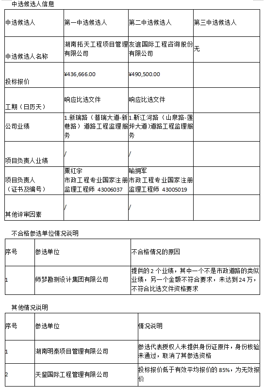 衡阳市雁城东路(东方里街-东二环)及雁城东路与建湘连接线新建工程监理服务内部比选中选候选人公示