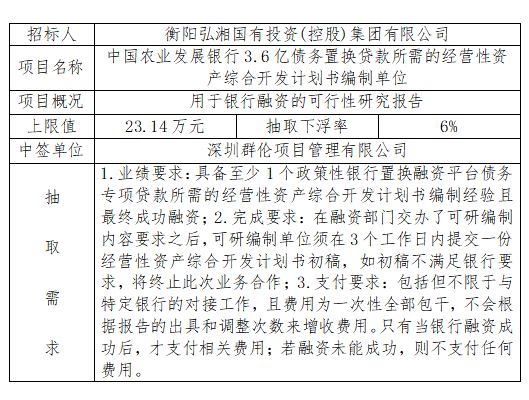中国农业发展银行3.6亿债务置换贷款所需的经营性资产综合开发计划书编制单位于2025年7月9日在衡阳国投4栋3楼评标室进行了随机抽取,现将相关信息予以公示。