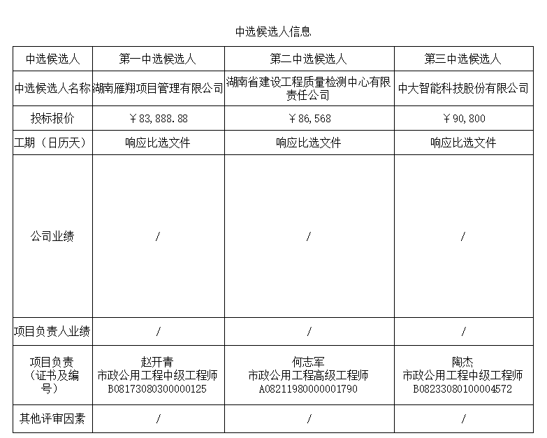 植物园片区雁云路(幸福河街-红峰路段)项目检测单位咨询服务比选于2025年08月21日15时00分在衡阳国投4栋3楼评标室进行了比选开标、评标活动,评标委员会按照比选文件及相关法律法规规定进行评审,推荐以下三名中选候选人(排序),现将相关信息予以公示。