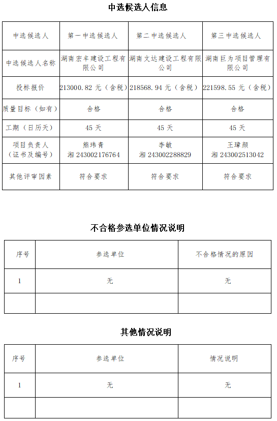 永州分公司涉水检验设施建设工程 于2025年9月25日在永州市冷水滩区长丰集团办公楼二楼评标室进行了比选开标、评标活动,评标委员会按照比选文件及相关法律法规规定进行评审,推荐以下三名中选候选人(排序),现将相关信息予以公示。