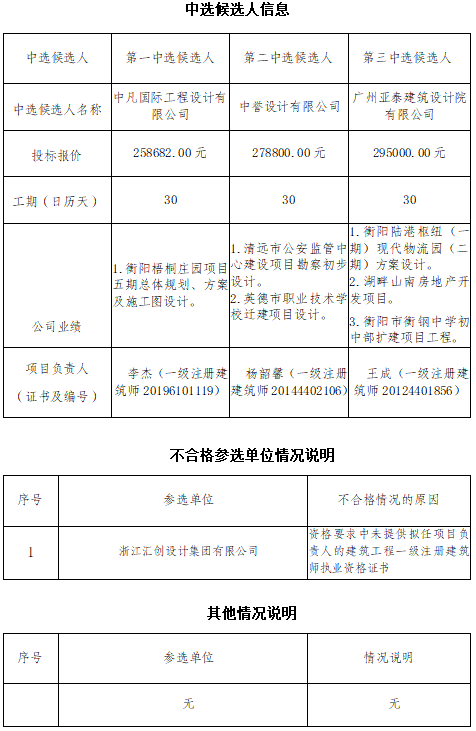衡阳(国际)眼镜小镇定制厂房一期项目方案设计于2026年1月23日在衡阳国投4栋3楼评标室进行了比选开标、评标活动,评标委员会按照比选文件及相关法律法规规定进行评审,推荐以下三名中选候选人(排序),现将相关信息予以公示。