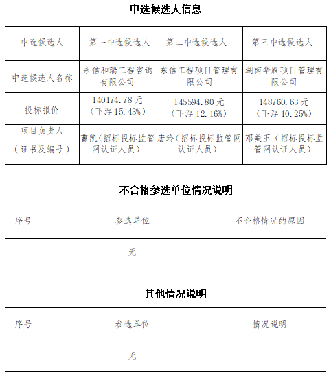 衡阳(国际)眼镜小镇人才公寓暨保障性租赁住房项目(二期)招标代理于2026年1月30日15:00在衡阳国投4栋3楼评标室进行了比选开标、评标活动,评标委员会按照比选文件及相关法律法规规定进行评审,推荐以下三名中选候选人(排序),现将相关信息予以公示。
