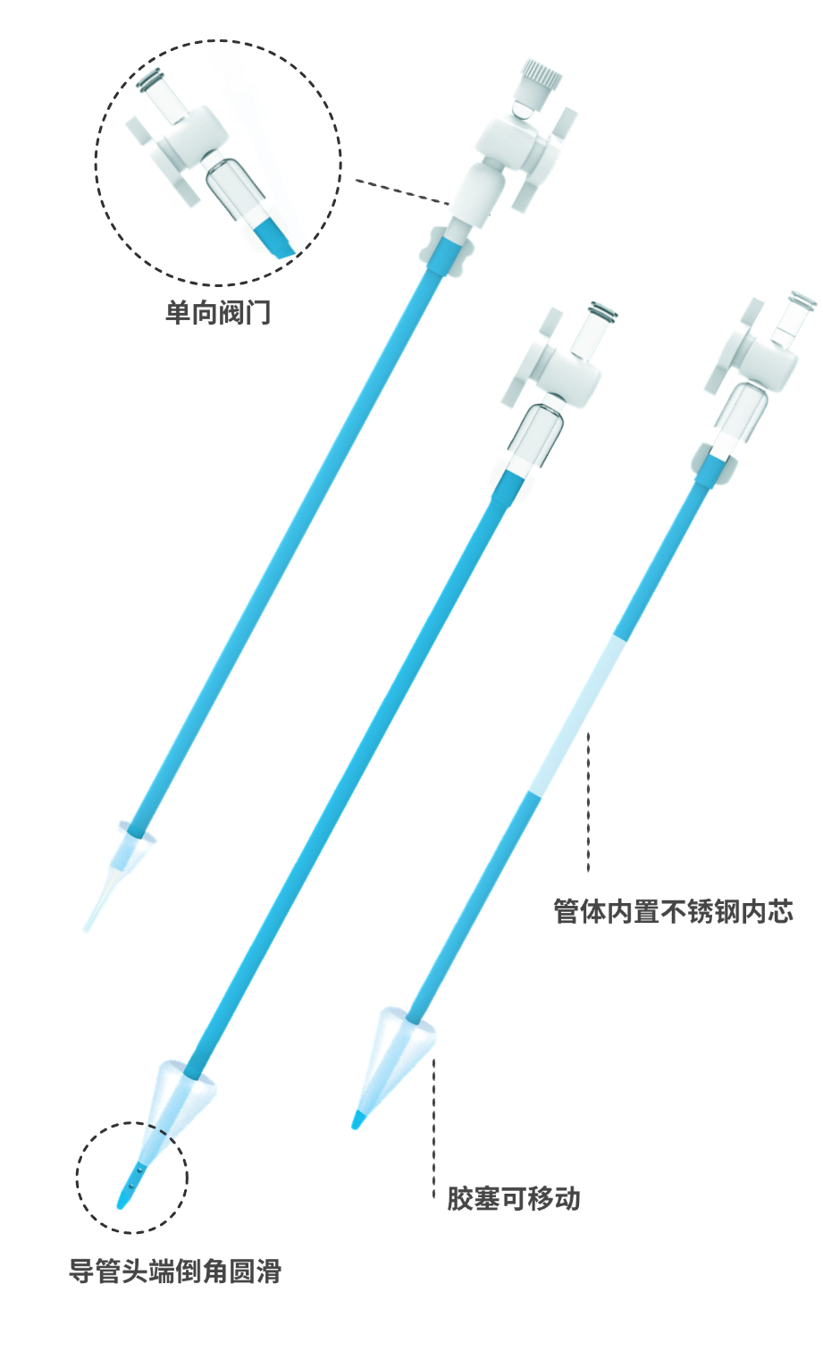 導管頭端倒角圓滑,避免損傷子宮內壁;兩側數枚開孔,造影劑注射暢通,不易堵塞。